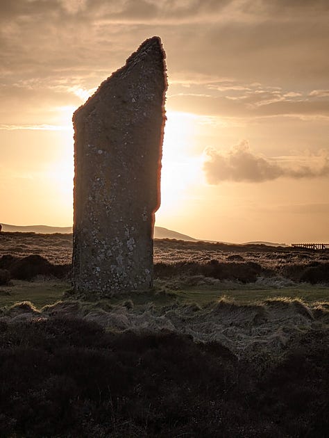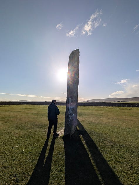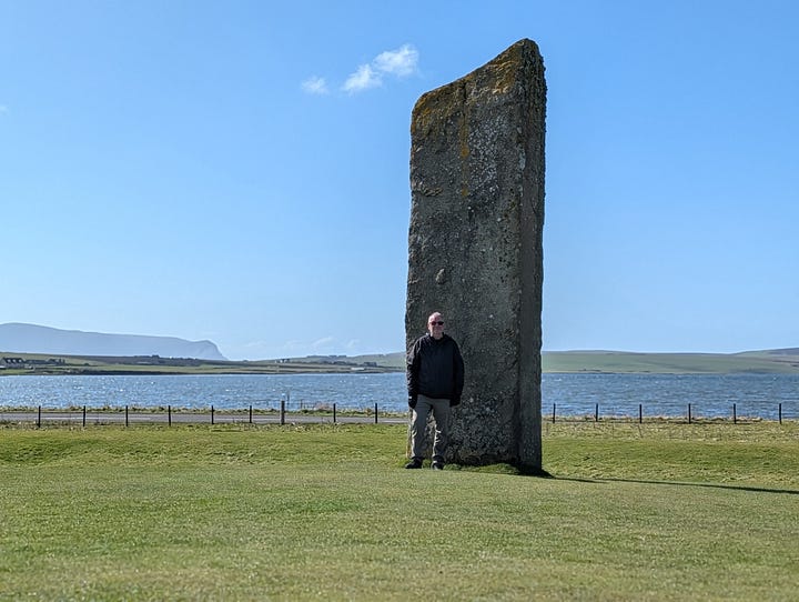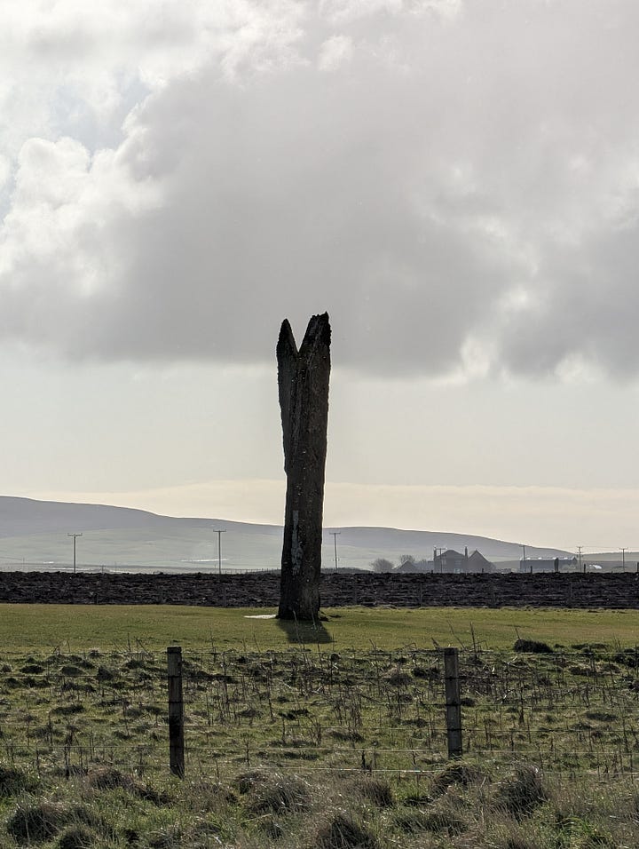 Anyway, the Stones of Stenness are mightily impressive (as is the wind chill as we approach them!). Probably the tallest that I have seen other than the Rudstone Monolith in Yorkshire, which is about 2 metres (let’s call it 6 or 7 feet as these sites were laid out according to older measures) taller than these.