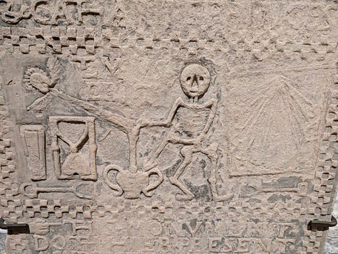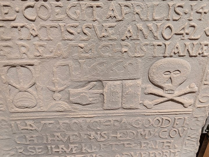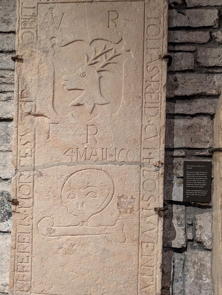 There are lots of people buried within the walls and the markers are very heavily decorated with skulls and bones, although one of them looks more like an alien grey than a human skull. Who knows, maybe Orkney had a visitation?