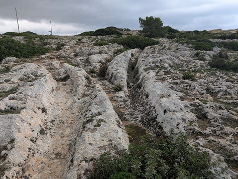 As I fight my way across the building site which (Google leads me to believe) is the way to the track location, I notice that there are a number of Punic tombs in close proximity. Malta is like that: random historical stuff everywhere that no one takes any notice of. Wander off the beaten track and there are wonders to be discovered (OK, I will admit that some grooves in the ground may be stretching the meaning of wonders)