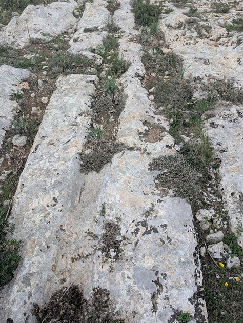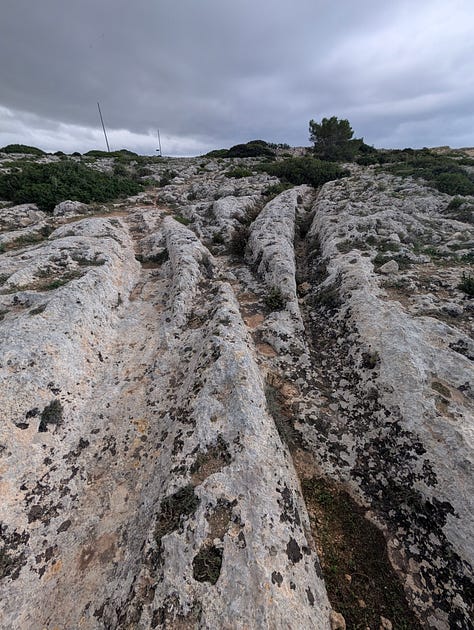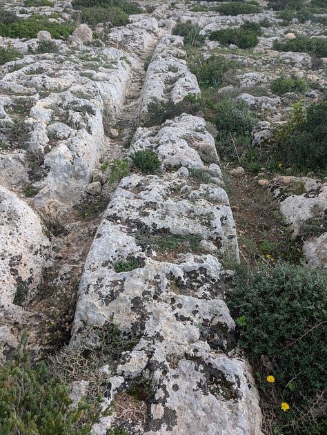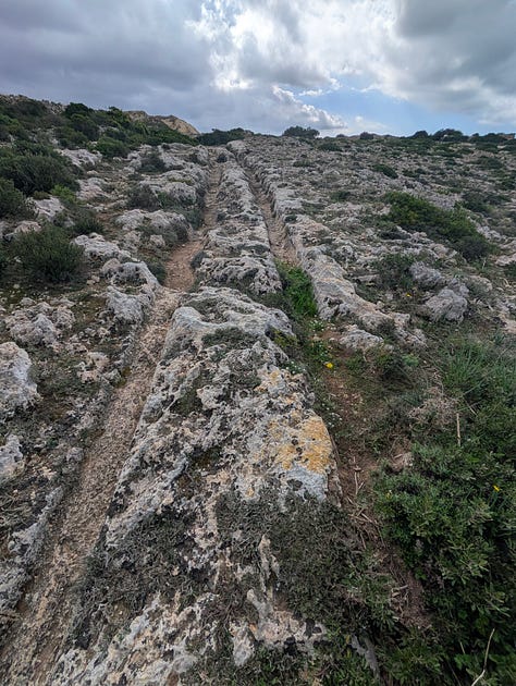 Anyway, I find the tracks (and some bonus caves that I wasn’t award of into the bargain). The cart tracks are quite wide spread across Malta and Gozo. they were man-made in prehistoric times, but no one seems to know what they were for. The Clapham Junction moniker refers to the fact that many of these cross in this place.